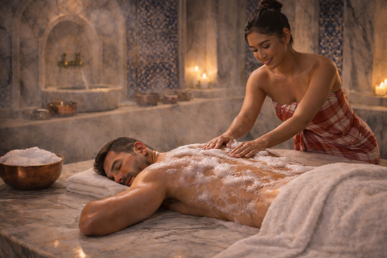 A traditional cleansing ritual with steam, exfoliation, and foam massage.