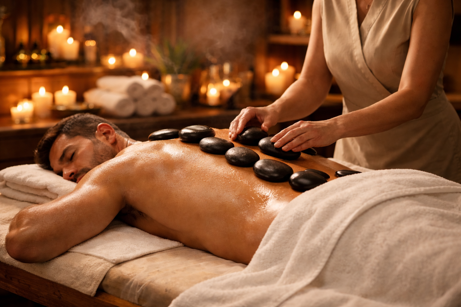Warm stones placed on the body help melt muscle tension and enhance relaxation.